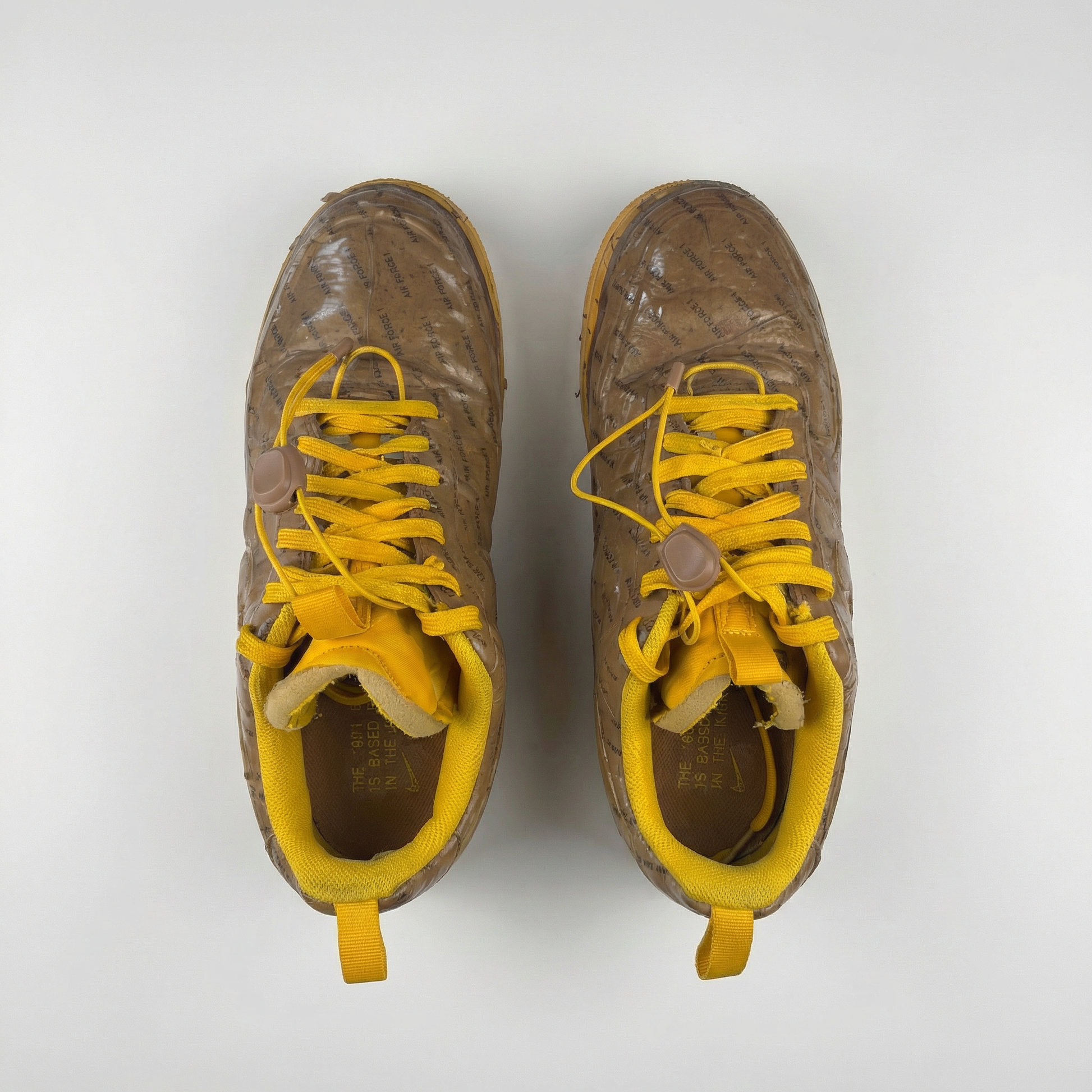 One of the most conceptually bold AF1 releases. The entire upper is encased in a crinkled brown packing tape-textured overlay printed with repeating “Air Force 1” text, mimicking a shipping parcel. University Gold lace toggle, bright yellow laces, tonal gold outsole, and “Air Force I — N.354 — For Everyday Use” branding panel at the heel. Classic AF1 cupsole silhouette underneath the deconstructed aesthetic. Released April 2021.